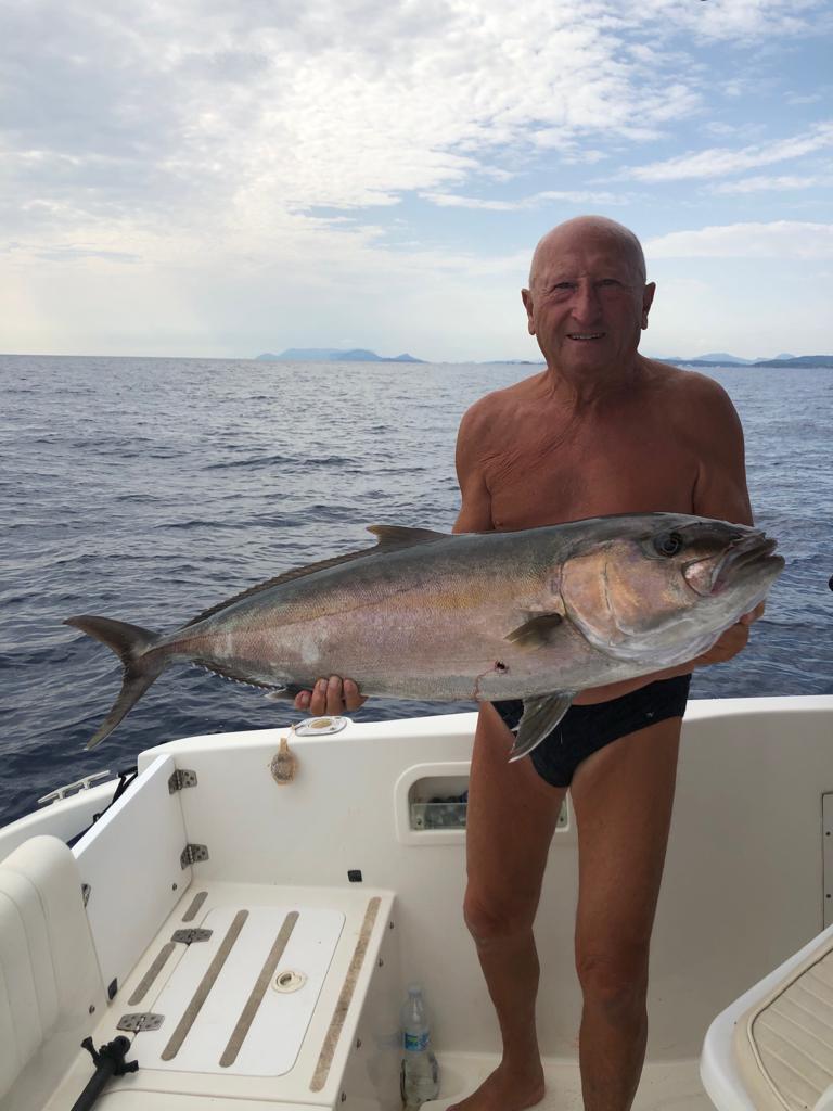 Salve a tutti, l’aguglia e la ricciola le ho pescate con un terminale da 0,50 amo 3.0 trainante e 5.0 pescante, piombo g.250 a mezz’acqua canna Fenice 10lb