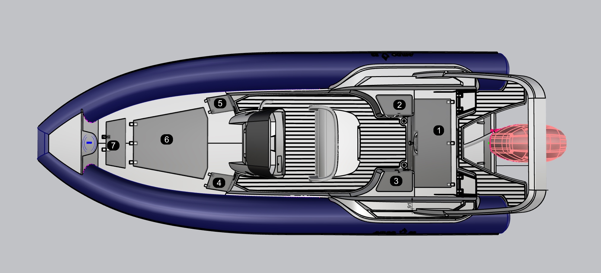 A poppa , il classico gavone centrale con 2 gavoni controstampati ai lati della dinette. Se non viene installato il frigo a cassetto sotto la seduta guida, anche quello spazio consente lo stivaggio. Ai lati della consolle erano presenti di progetto due piccole nicchiette , che poi però abbiamo ritenuto di eliminare per via delle piccole dimensioni, dato che anche la consolle è dotata di portaoggetti. A prua il gavone centrale è enorme, si può entrare dentro, sarebbe ideale anche per un tender sgonfiabile. A estrema prua altro gavone separato , mentre il portello prodiero sul prendisole è l' ispezione per il gavone verricello.
