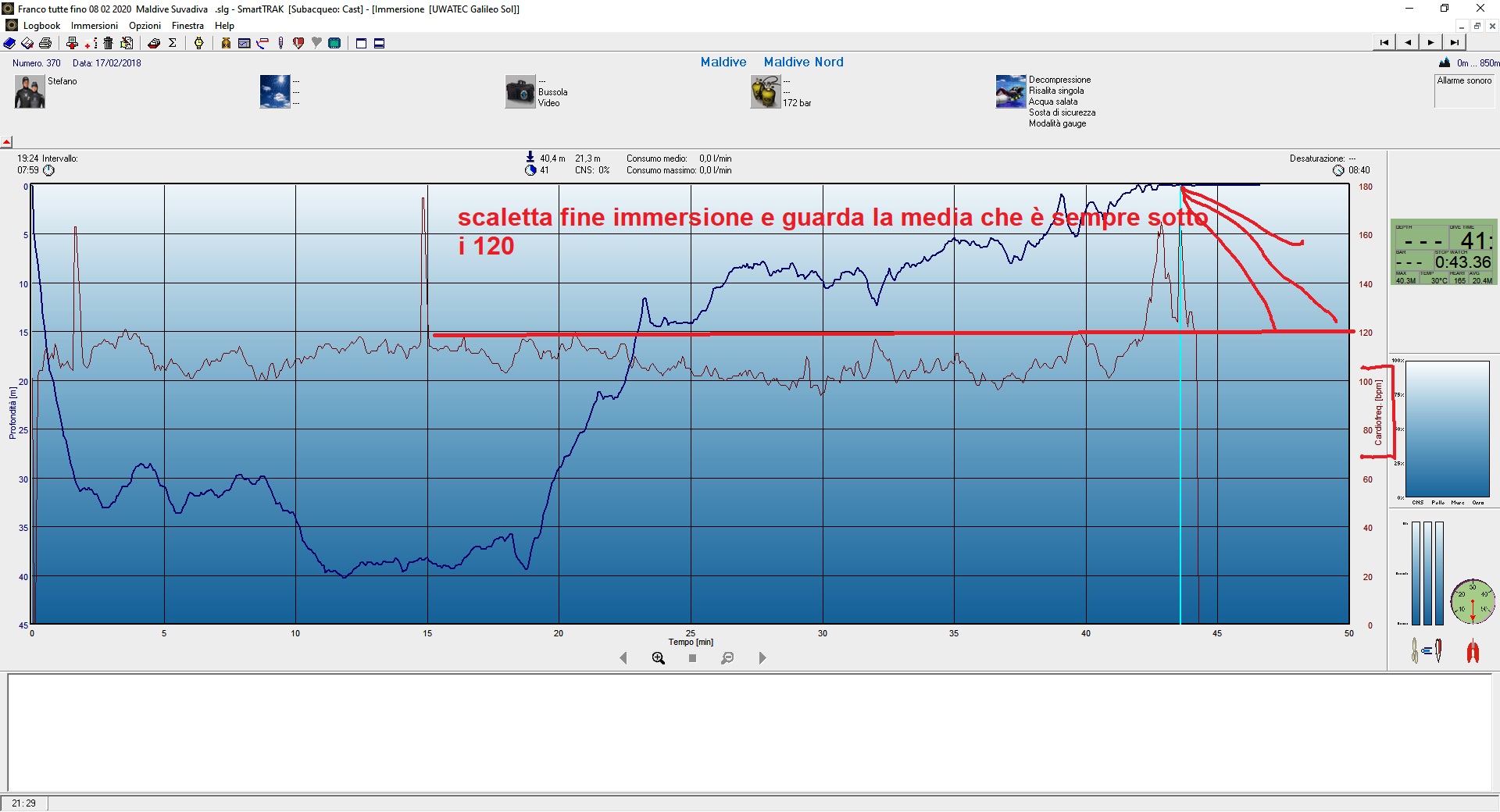 Ora per precauzione mi sono dato la regola di fare un gradino e mi fermo per alcuni secondi e altrettanto sul secondo e cosi via, ( di solito risalgo la scaletta per ultimo del gruppo cosi nessuno mi pressa ) cosi facendo i battiti rimangono un po sotto alle punte che sono evidenziate nelle foto ( queste sono immersioni che ho fatto a 73 anni ma le ritengo del tutto normali ) computer Galileo Terra della Uwateck con cardiofrequenzimetro al torace, con quanto ho riportato diciamo che siamo fuori dai valori che riportano molti scritti.