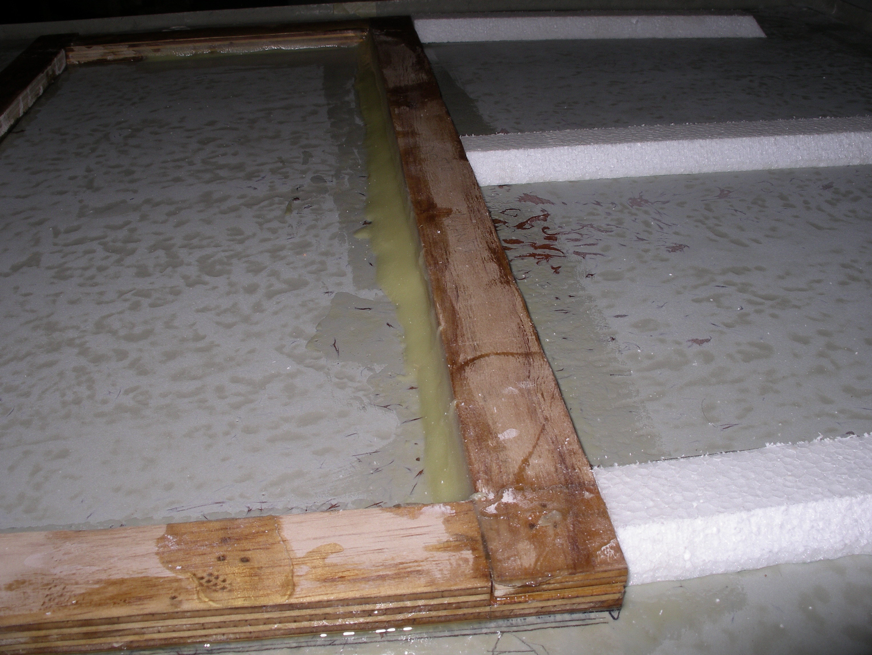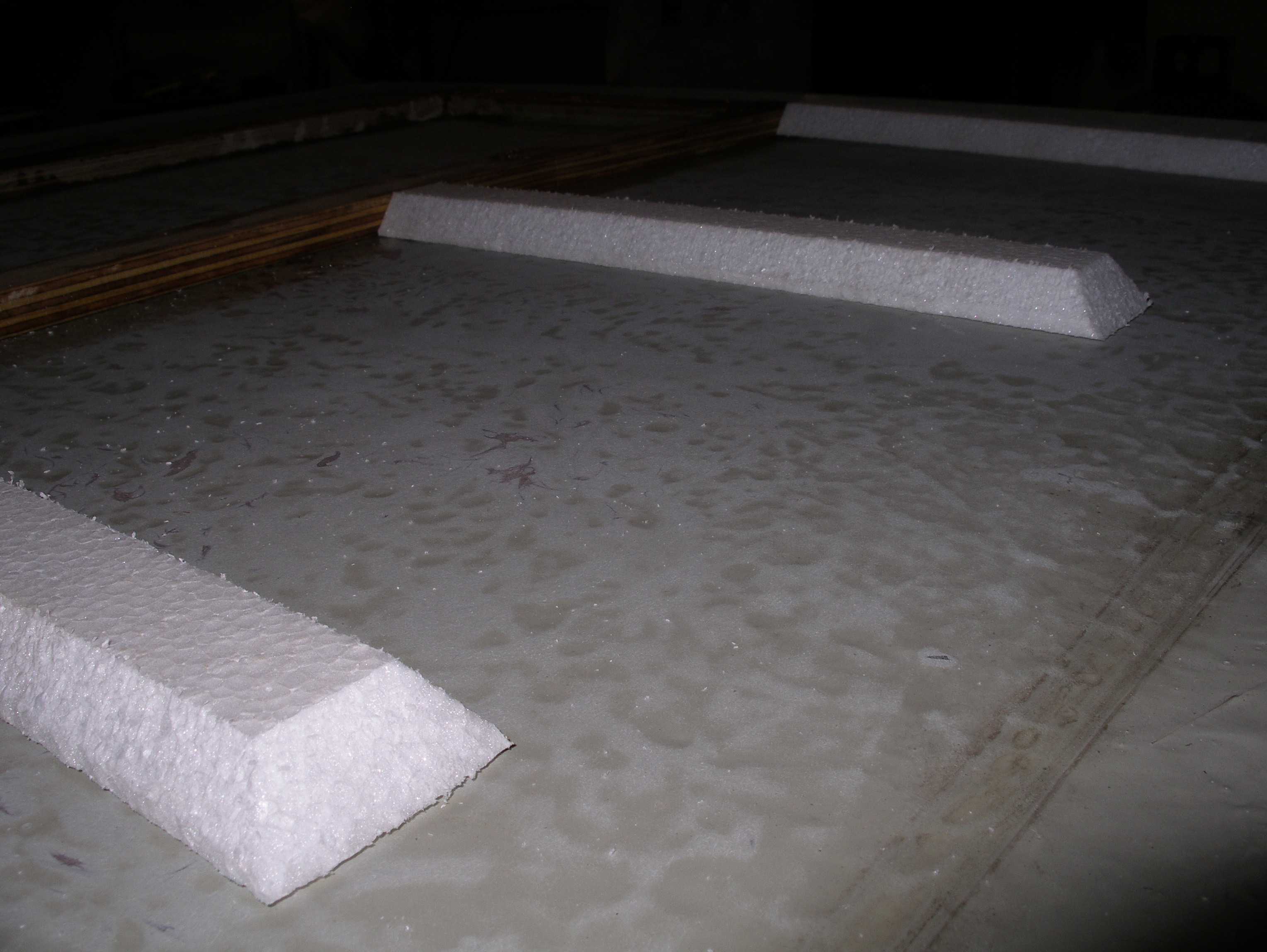 Ho realizzato n.3 longheroni di irrigidimento in composito (polistirene rivestito da 3 strati di tessuto di vetro ed epox fissati anch’essi alla parte inferiore del pagliolato, in modo da rendere più resistente il tutto. Ecco le foto: