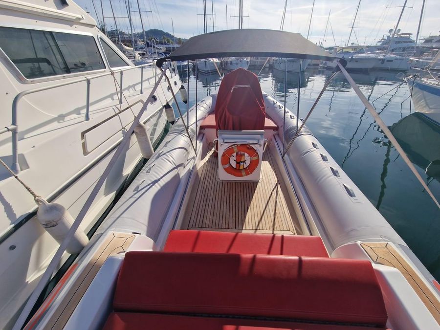 Una caratteristica che balza evidente è l’impostazione “automobilistica” degli spazi di coperta con almeno 8 posti a sedere entrobordo (non sui tubolari) di cui due rivolti indietro. Caratteristica positiva non comune per un RIB di 6,5 mt. classe 1999 ma che comporta una seduta “bassa” per il timoniere con conseguente ridotta portata visiva per le distanze medio-basse dalla prua.