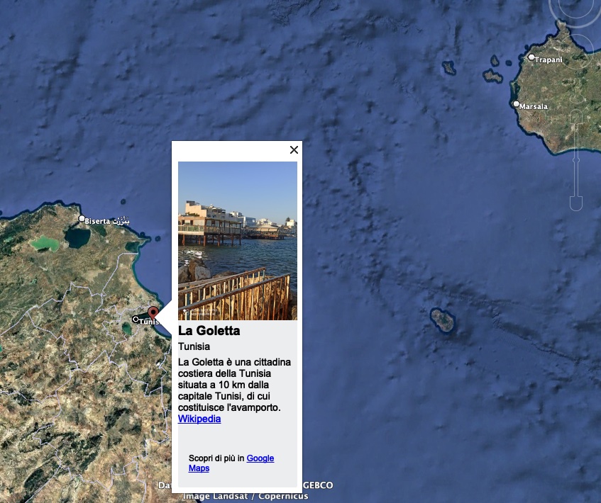 Bella foto: si vede anche Pantelleria e la provincia di Tràpani; vediamo à mostrare più nel particolare La Gouletta, quasi Siciliana a quell'epoca: questo canale, dove erano omeggiate le barche dei piscaduri Ciciliani, non c'è piu! Hanno allontanato il porto di pesca e traciato un viale davanti à questi vestigi. E<ignor Drago, che faceva ottime barche di pesca, naviga adesso sulle onde celeste.... Requiem.