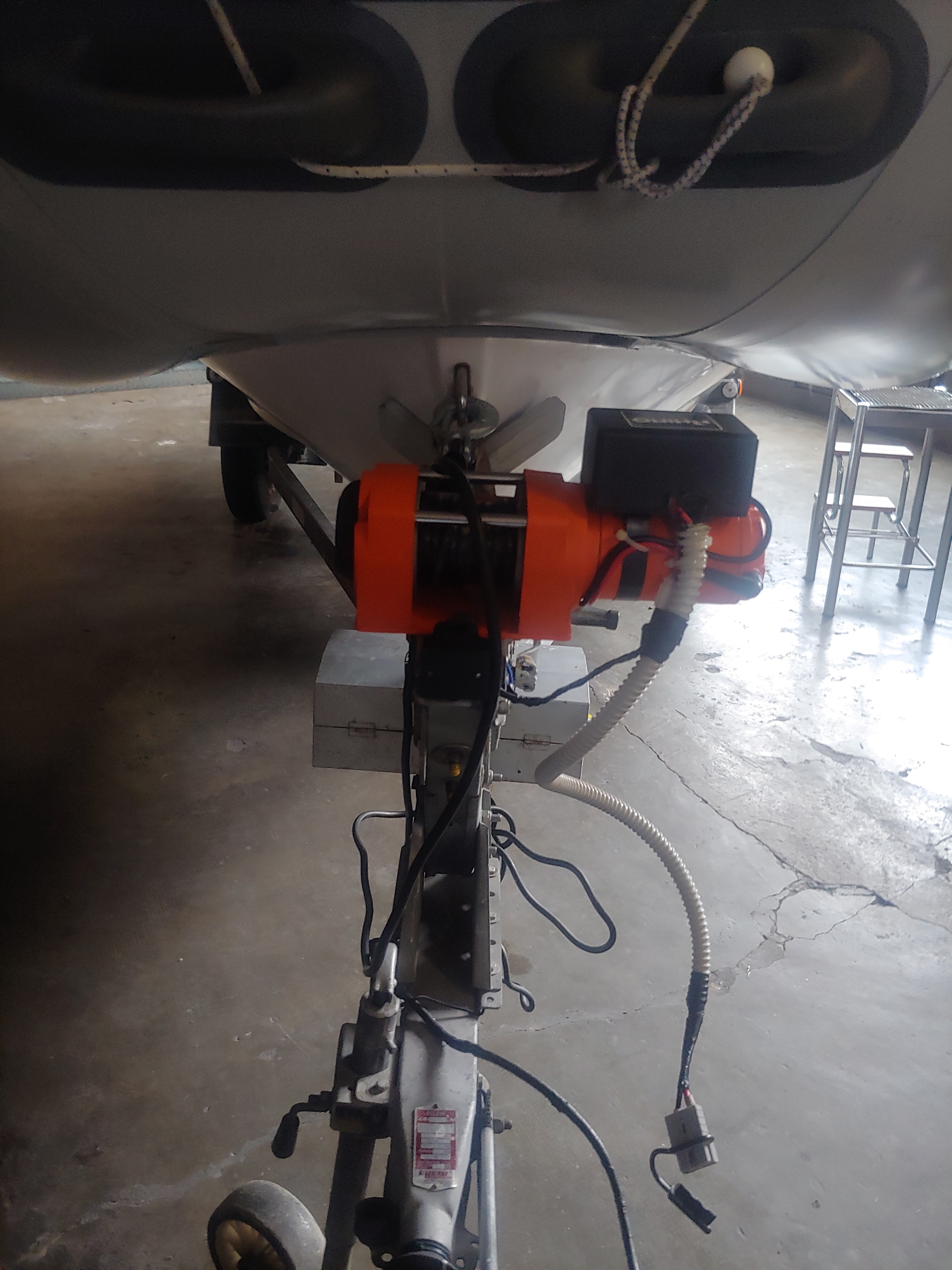 Quella cassa bianca che vedi sul timone del carrello contiene una batteria 12 V: io utilizzavo una normale batteria d'avviamento, tolta dall'auto perchè non più efficace. Era una 100 AH che mi bastava per 4-5 vari/alaggi e poi la portavo a casa per ricaricarla