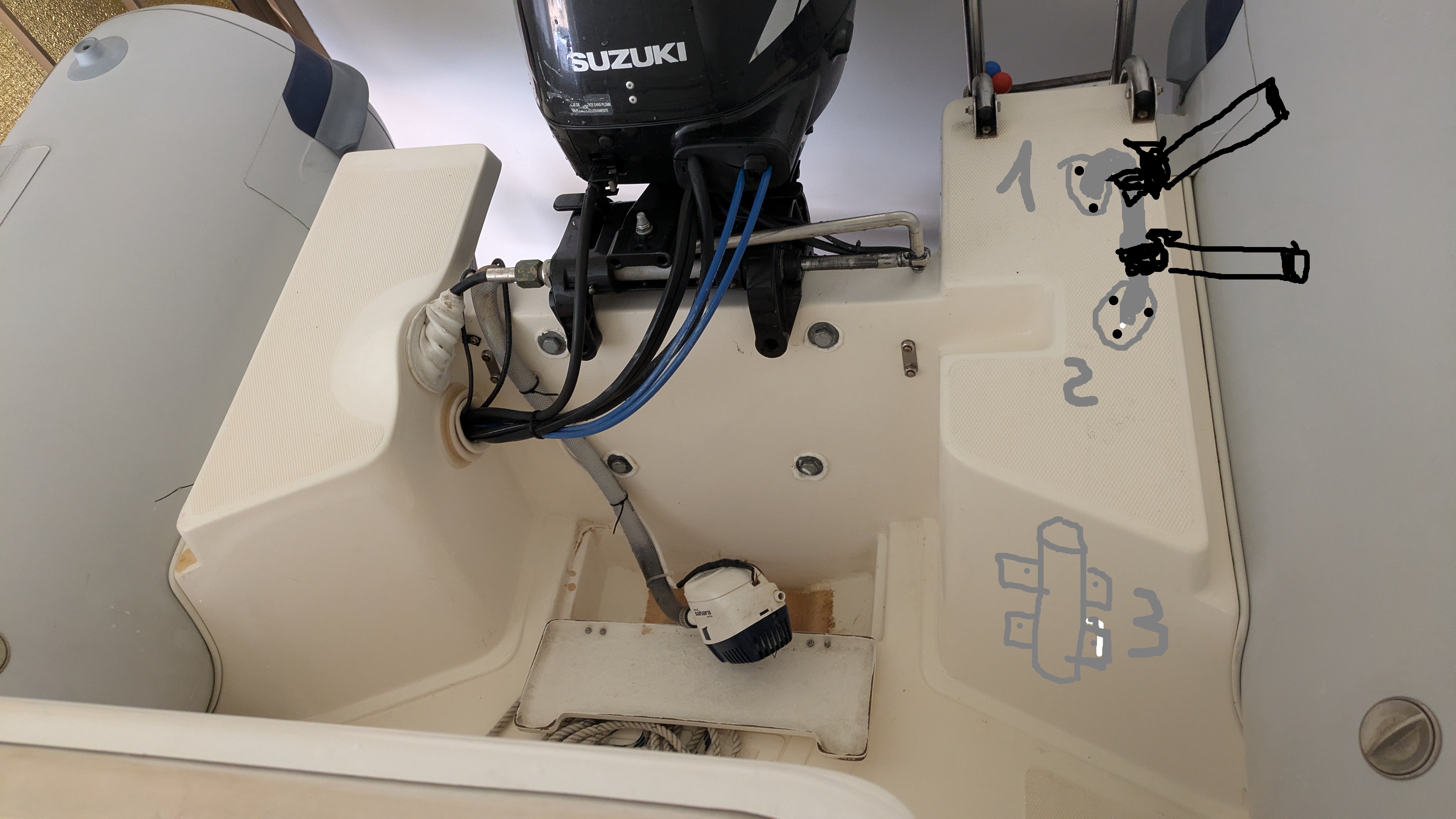Dove vedete il numero 1, riesco a mettere una piccola contropiastra sottostante per fissare le 3 viti, quindi non c'è problema, dato che quella miniplancetta sporge oltre lo specchio di poppa e sotto è vuoto.