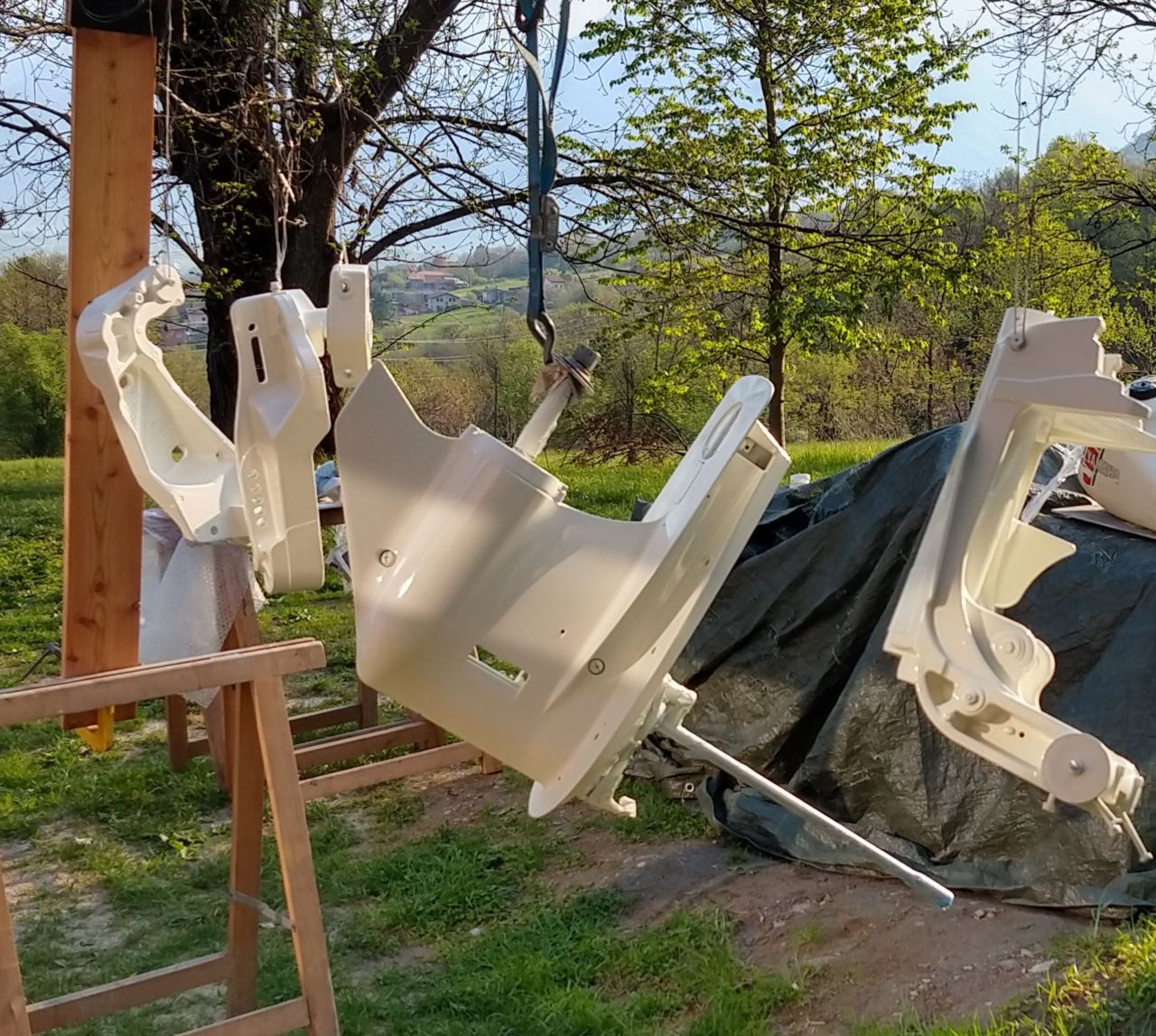 Per il piede mi ha consigliato un fondo, tipo quello automobilistico, dopo carteggio. Le bombolette sono state usate sopra il fondo per il piede e per alcune parti del cavalletto. La parte sotto il cavalletto era di un colore grigio scuro che ho ripristinato.