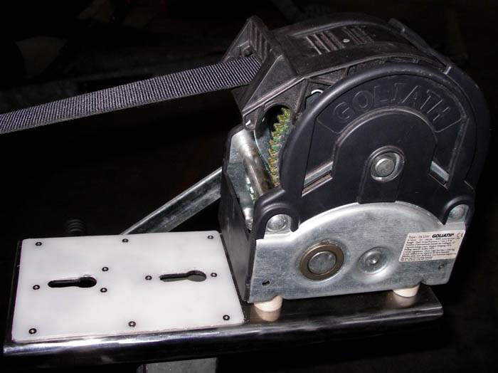 A sua volta anche il verricello manuale può essere facilmente sfilato dal piantone del carrello (dove si possono notare i fori del perno passante di ancoraggio) in modo solidale con la piastra di supporto.