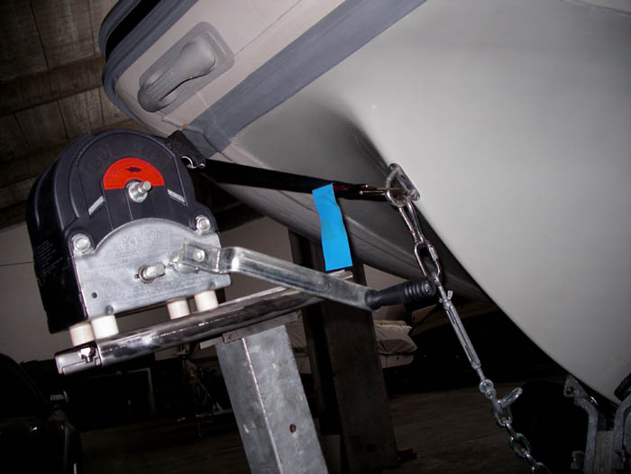 entrambi i verricelli solo montati su una piastra inox fatta realizzare su misura con piegature di irrigidimento saldata su un piantone a sezione quadrata che si innesta di misura in quello del carrello e viene a questo ancorato con bullone passante dotato di manopole per lo smontaggio manuale senza attrezzi.