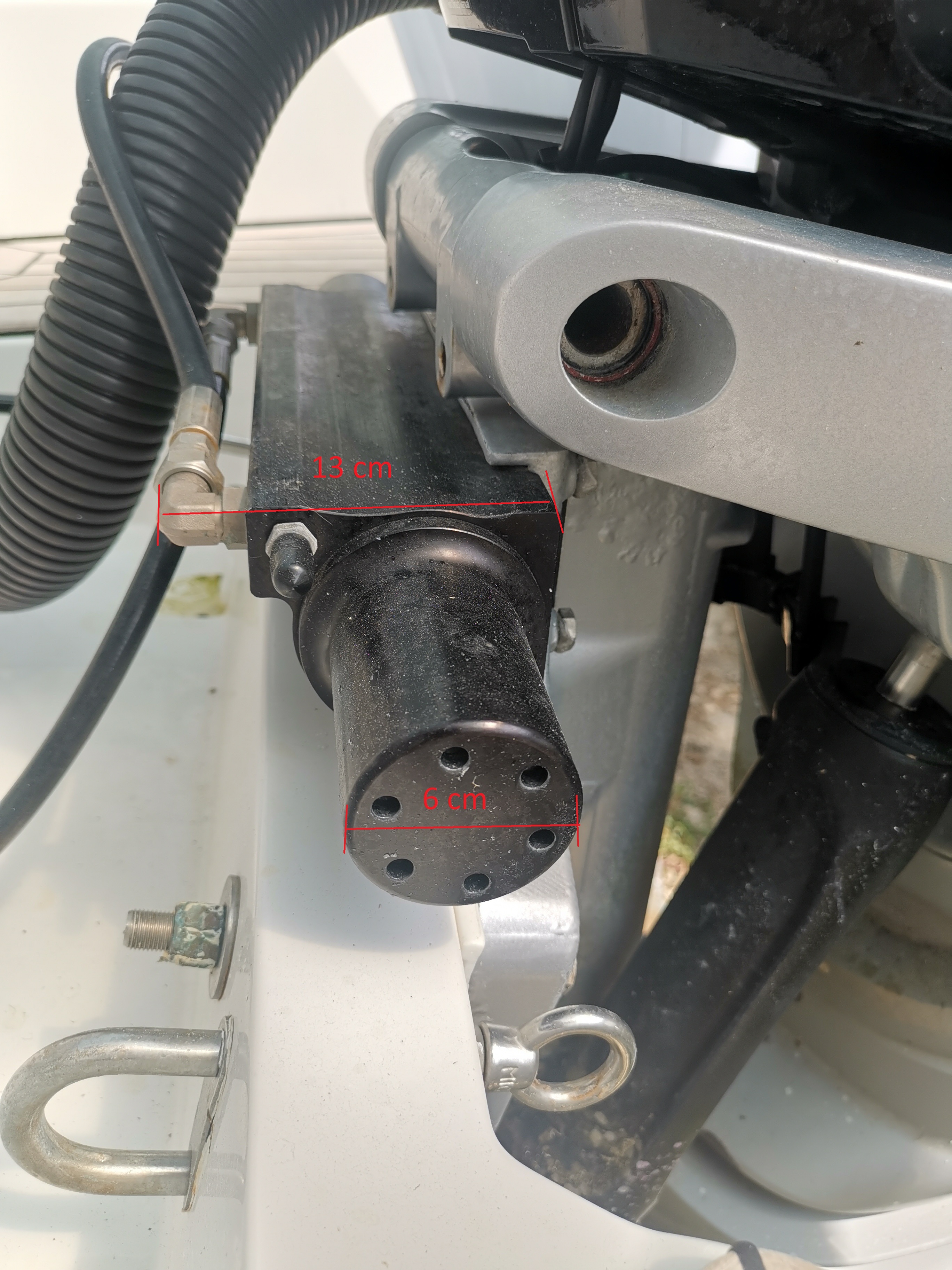 In primis, ho rimisurato (il più precisamente possibile) l' attuale altezza di montaggio del motore e la distanza che intercorre tra piastra anticavitazione e pianetto di poppa: millimetro più, millimetro meno sono a 4,8 cm A questo punto ho preso anche le misure di ingombro dell' idroguida del Verado (corpo unico con la piastra del motore) che sono le seguenti: