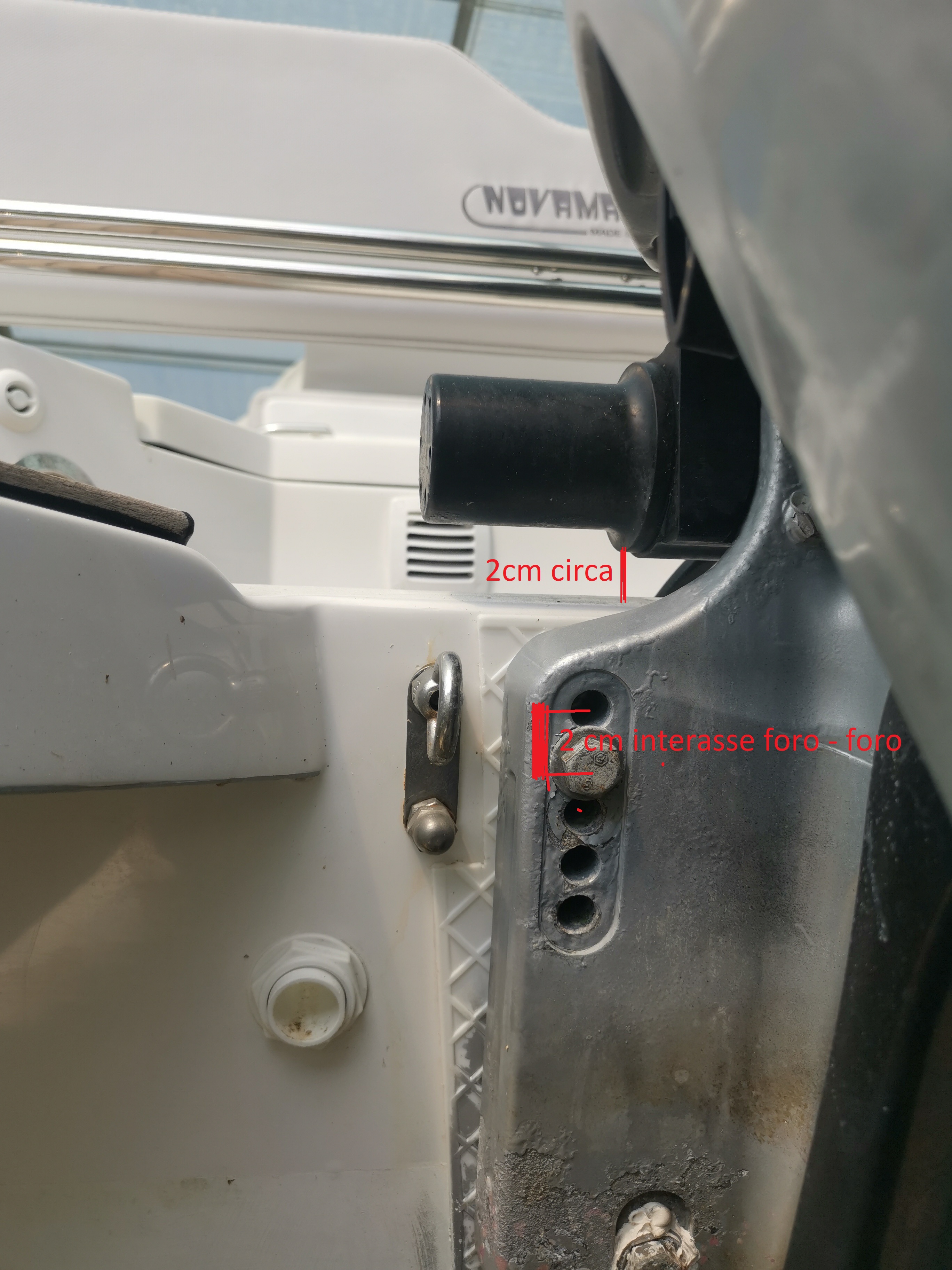 Diametro del cilindro: 6cm Infine ho anche misurato (più o meno perchè non avevo un calibro) lo spazio residuo tra cilindro e parte superiore dello specchio di poppa che è grosso modo 2cm Da questo deduco che: essendo l' interasse foro-foro esattamente 2cm NON ho la possibilità di abbassare di un ulteriore foro motore (pur avendolo) poichè con quasi certezza andrebbe a poggiarsi il cilindro sullo specchio di poppa quindi devo necessariamente allontanare il motore dallo specchio di poppa.