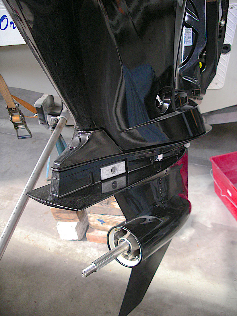 Prima del montaggio del power lift (Bobs Machine con spessore di 8”= 20 cm. circa), a causa della lunghezza insufficiente del piede la piastra anticavitazione, collocando il motore in posizione appoggiata al bordo superiore dello specchio di poppa (quindi la più bassa possibile), si trovava ad un’altezza di 18 mm. dal calcagnolo di poppa come da riferimento tracciato a penna: