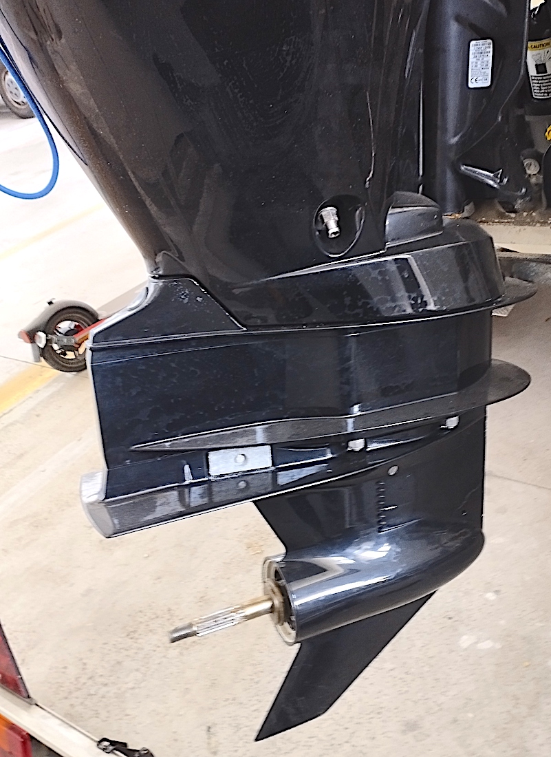 Per essere precisi la piastra anticavitazione (in posizione neutra del trim) passa (in conseguenza dell’allungamento del piede e dello spostamento sul PL) da – 45 mm rispetto al calcagnolo di poppa nella posizione più bassa a + 105 mm in quella più alta. Possibilità quindi non solo di navigare in bassi fondali (nonostante il piede XL) ma di variare a piacimento l’assetto longitudinale di Era Ora scegliendo l’angolo di trim per la migliore spinta possibile. In conseguenza dell’innalzamento della parte termica del motore rispetto allo specchio di poppa è stato necessario allungare il tubo corrugato contenente il tubo della benzina e i cavi dei telecomandi gas e cambio (fortunatamente non li ho dovuti sostituire perché già di lunghezza abbondante). Nella foto si vede il tubo corrugato col trim nella posizione di massima elevazione: