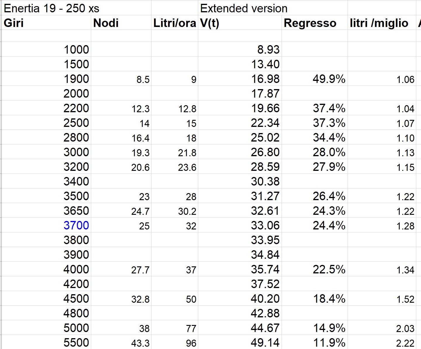 L' Akes 23 (ormai 25ft con l' estensione di carena aggiuntiva, 7.5 m x 2.5, 2000 kg) , era motorizzata con un singolo 250 optimax XS, con il quale toccava mediamente i 43 nodi a WOT con medio carico e carena pulita (ma con antivegetativa) e i 40 a fine stagione con carena sporca (perchè dalle nostre parti.. la vegetazione attechisce ANCHE sull' antivegetativa :no: ..) ; i consumi erano nell' ordine del 1.15/1.2 litri per miglio a velocità di crociera ottimale, che con un elica Enertia da 19 pollici, erano intorno ai 3600 giri - 24 nodi.