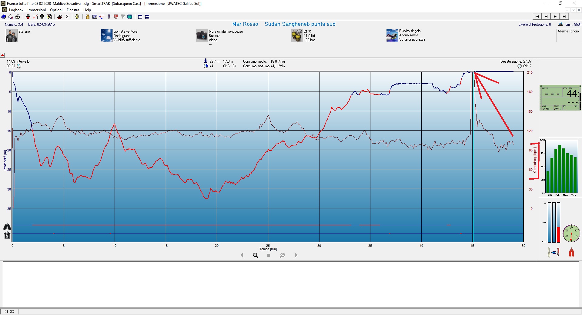 Ora per precauzione mi sono dato la regola di fare un gradino e mi fermo per alcuni secondi e altrettanto sul secondo e cosi via, ( di solito risalgo la scaletta per ultimo del gruppo cosi nessuno mi pressa ) cosi facendo i battiti rimangono un po sotto alle punte che sono evidenziate nelle foto ( queste sono immersioni che ho fatto a 73 anni ma le ritengo del tutto normali ) computer Galileo Terra della Uwateck con cardiofrequenzimetro al torace, con quanto ho riportato diciamo che siamo fuori dai valori che riportano molti scritti. ok