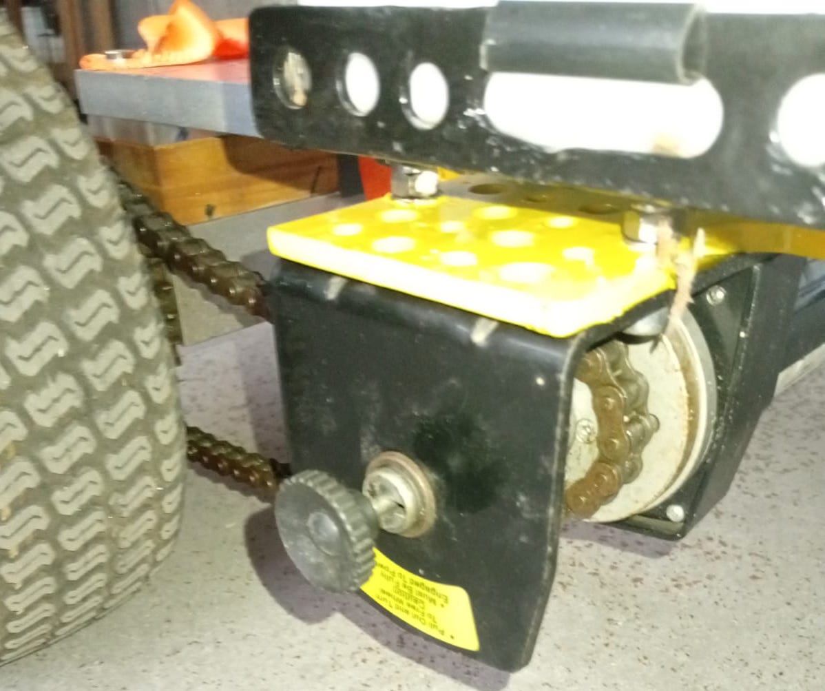 3) Ho sostituito (come si vede nella foto precedente) i due ruotini di piccolo diametro con una unica grande ruota pivottante (tra l’altro con freno a pedale) di cui ero già in possesso per altri progetti accantonati. Con la conversione in triciclo ho evitato che su superfici irregolari uno dei ruotini del complesso quadriciclo originale andasse a vuoto scaricando sull’altro tutto il peso. Ovviamente, vista la maggiore altezza della ruota pivottante rispetto ai preesistenti ruotini, per rendere lo chassis orizzontale ho montato uno spessore adeguato in corrispondenza delle ruote motrici.